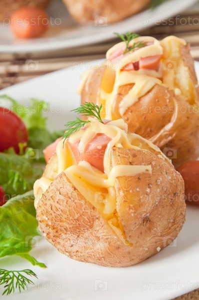 Запеченный картофель с сосисками и салат