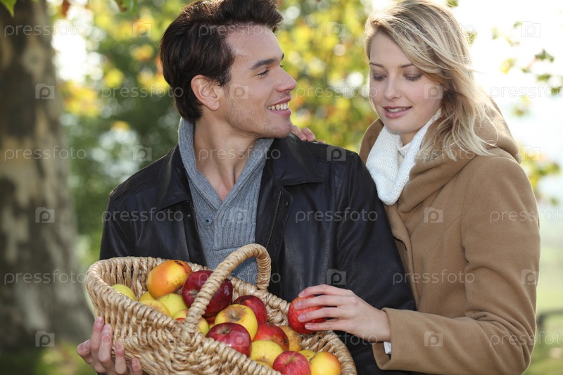 Пара, собирающая яблоки
