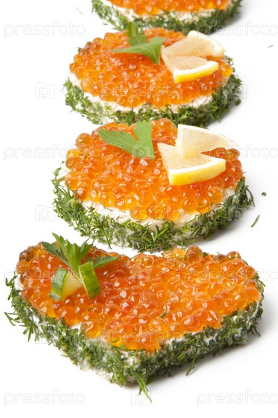 Бутерброды с красной икрой на белом фоне