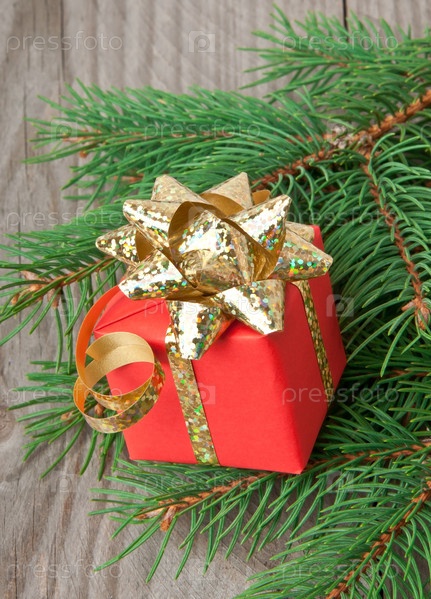 Красный подарок и ветка ели на деревянном фоне