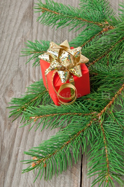 Красный подарок и ветка ели на деревянном фоне