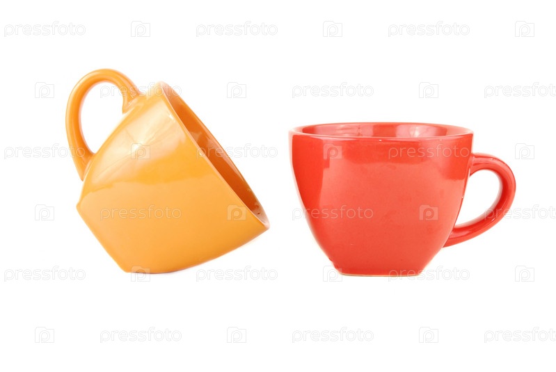 Желтая и красная кружки из глины на белом фоне