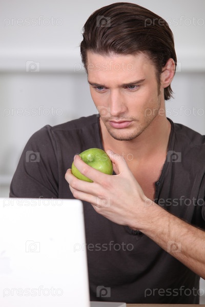Мужчина ест зеленое яблоко