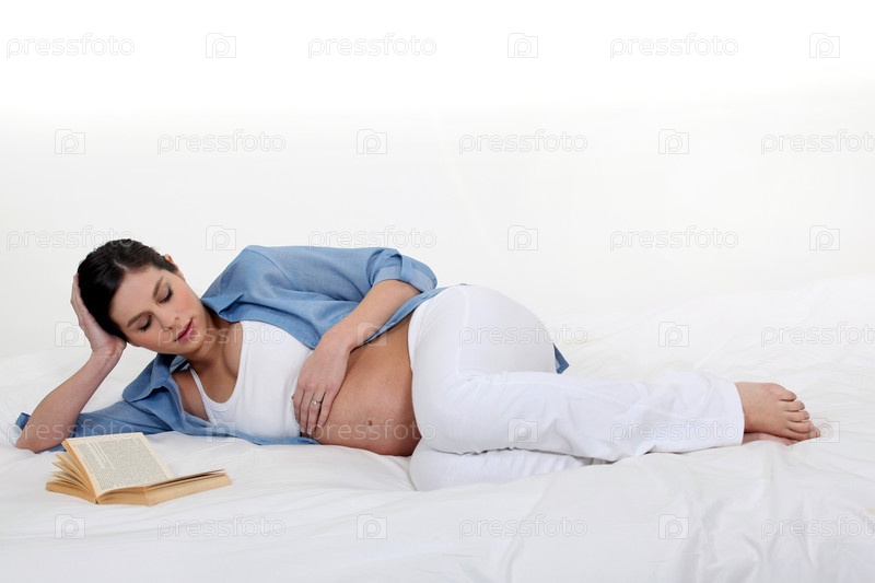 Беременная женщина читает в постели