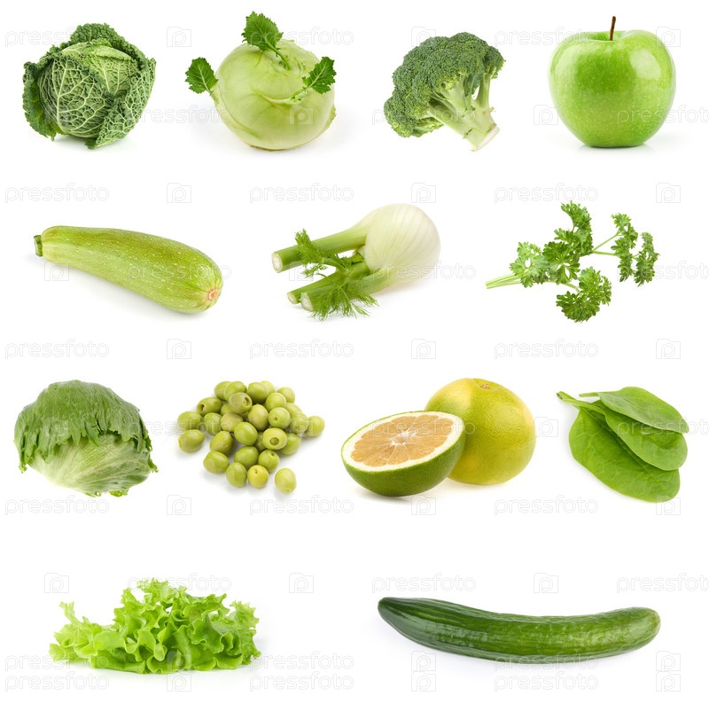 Зеленые овощи и фрукты на белом фоне, коллаж