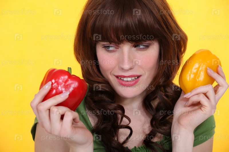 Женщина, держащая красный и желтый перец