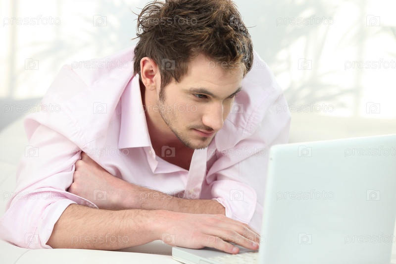 Молодой мужчина лежит перед ноутбуком