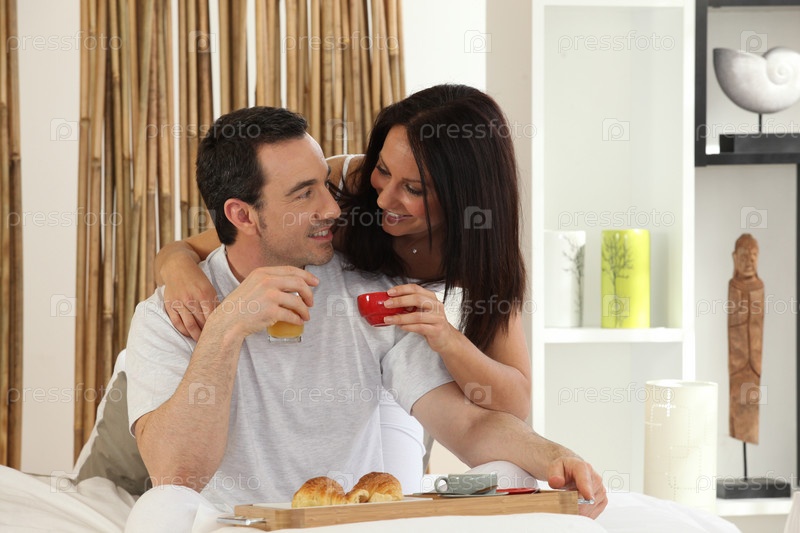 Счастливая пара завтракает в постели
