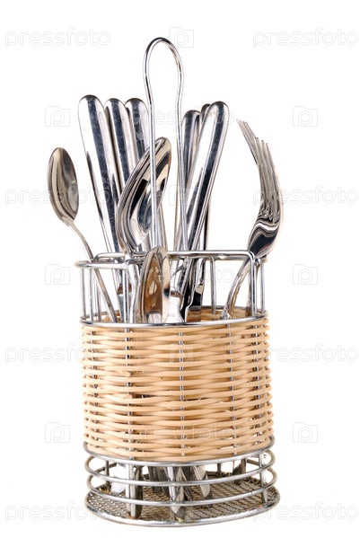 Ложки, вилки и ножи в специальной подставке на белом фоне