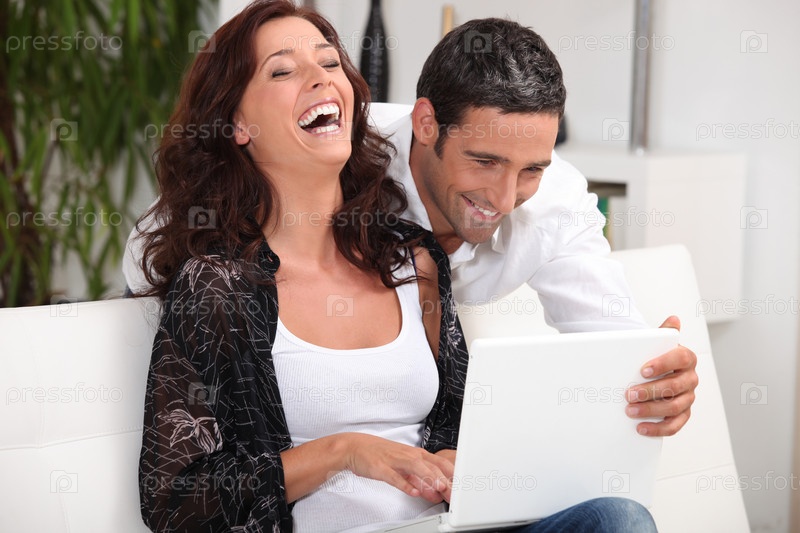 Пара смеется, глядя в ноутбук