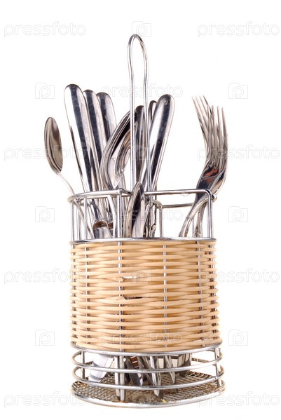 Ложки, вилки и ножи в специальной подставке на белом фоне