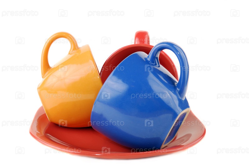 Разноцветный набор кружек на белом фоне