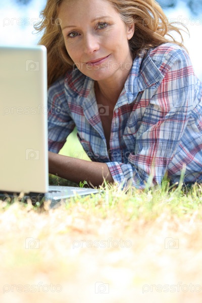 Блондинка лежит на траве с ноутбуком
