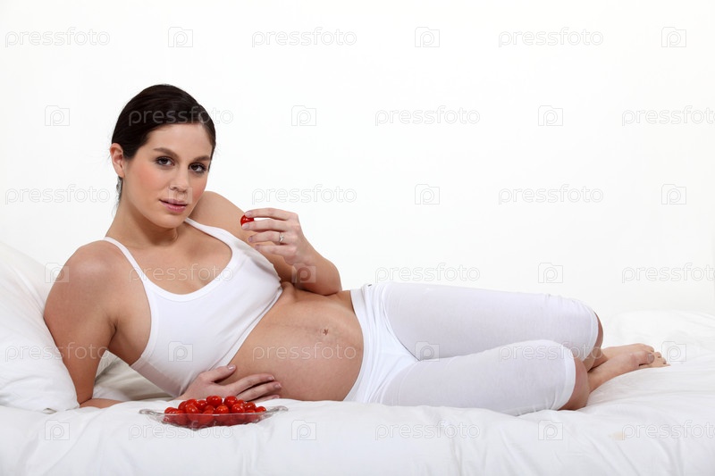 Беременная женщинаест клубнику, лежа на кровати