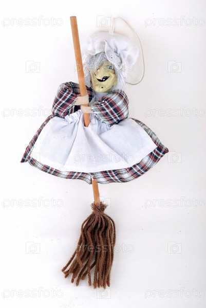 Кукла ведьмы с метлой на белом фоне