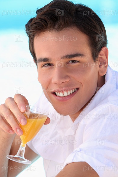 Молодой мужчина пьет апельсиновый сок