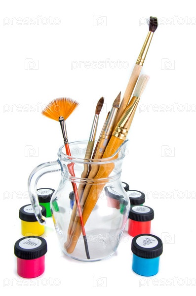Кисти в стеклянном кувшине с красками