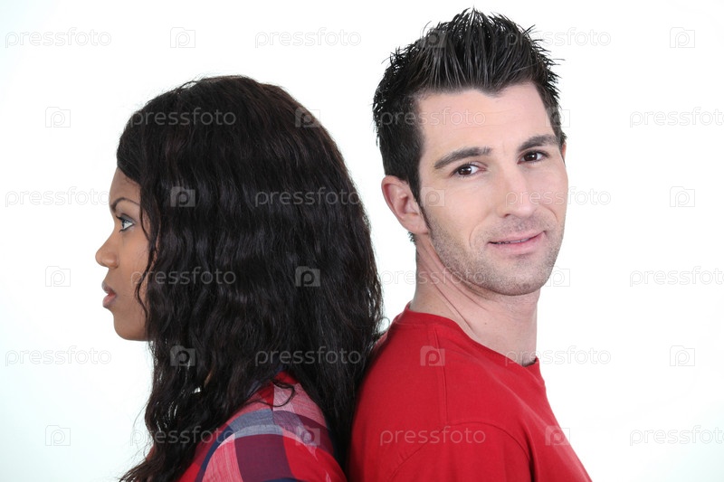 Молодой мужчина и темнокожая женщина стоят спиной к спине