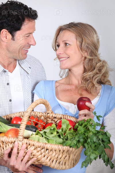 Пара с корзиной овощей смотрит в глаза друг друга