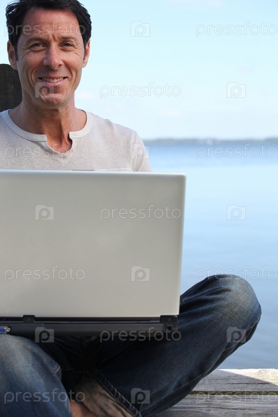 Мужчина с ноутбуком на набережной