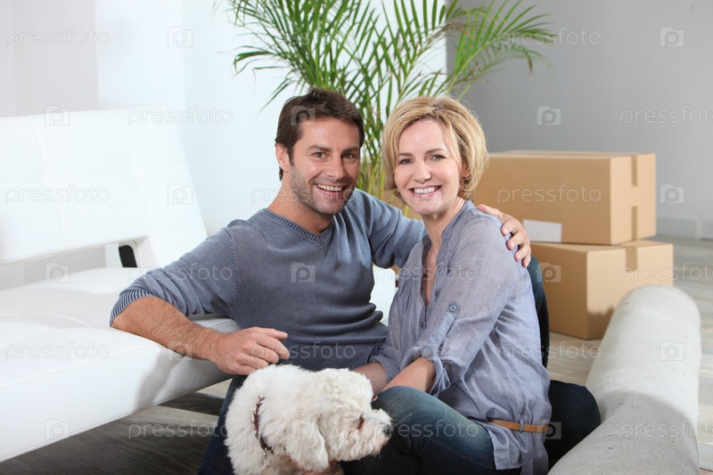Пара с собакой в новом доме