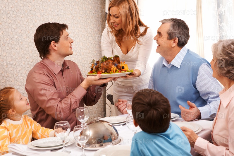 Портрет большой семьи, сидящей за праздничным столом и смотрящей на красивую женщину с блюдом из вкусной индейки