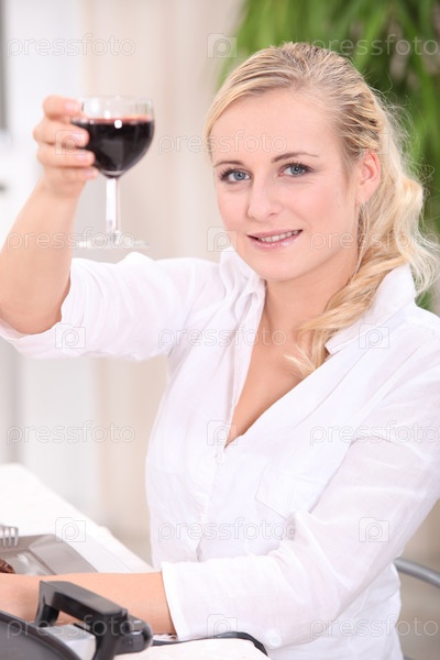 Блондинка пьет красное вино