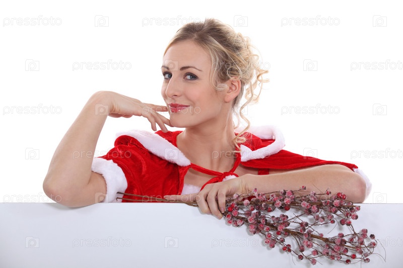 Блондинка в рождественском костюме с баннером