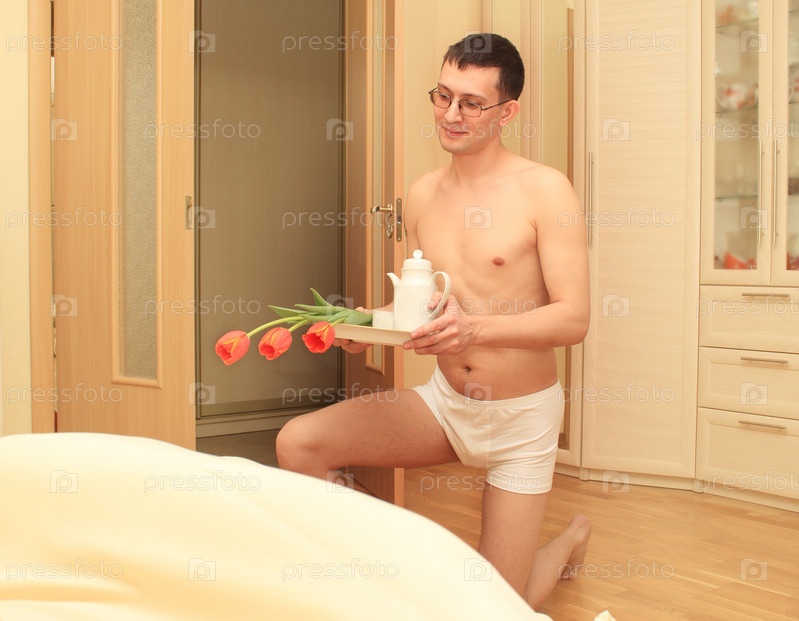 Завтрак в постель. Романтичный молодой человек с подносом и цветами