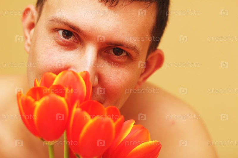 Романтичный улыбающийся молодой человек с цветами