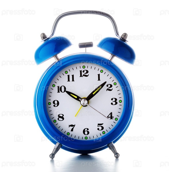 Старый синий будильник на белом фоне