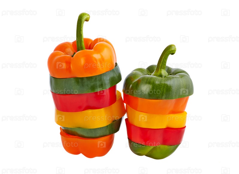 Нарезанный свежий красный, оранжевый, желтый и зеленый сладкий перец на белом фоне