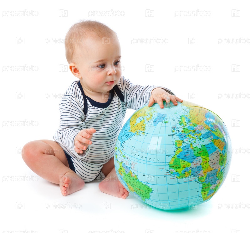 Ребенок играет с глобусом, на белом фоне