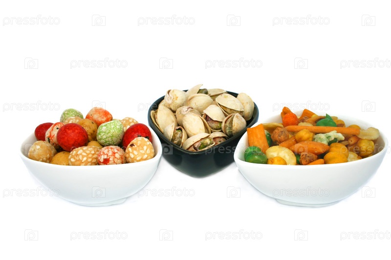 Ассорти соленых орехов в чашках, на белом фоне