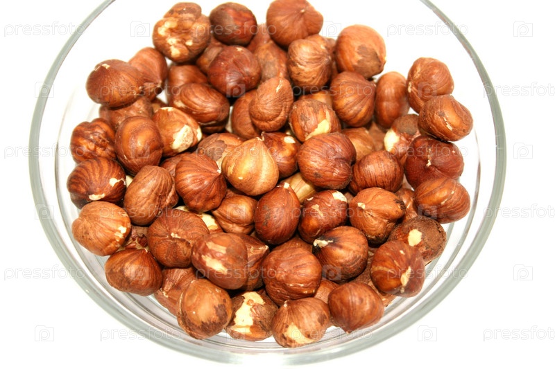 Фундук в прозрачной миске на белом фоне