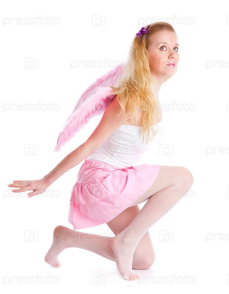 Девушка в розовом платье с крыльями за спиной, на белом фоне