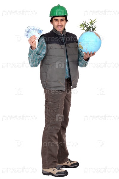 Строитель с наличными и глобусом с зелеными побегами