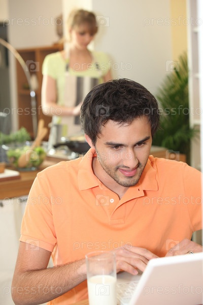 Мужчина работает на ноутбуке пока его жена готовит ужин