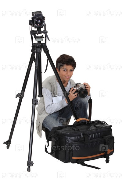 Мальчик с оборудованием фотографа
