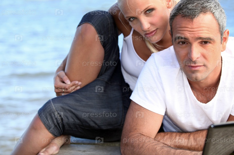 Седой мужчина с ноутбуком и подругой мледше его