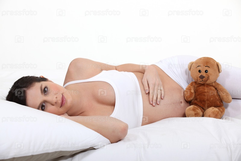 Беременная женщина лежит на кровати с плюшевым медвежонком