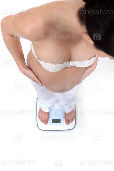 Беременная женщина взвешивается на весах
