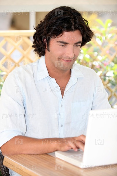 Повседневно одетый мужчина с ноутбуком
