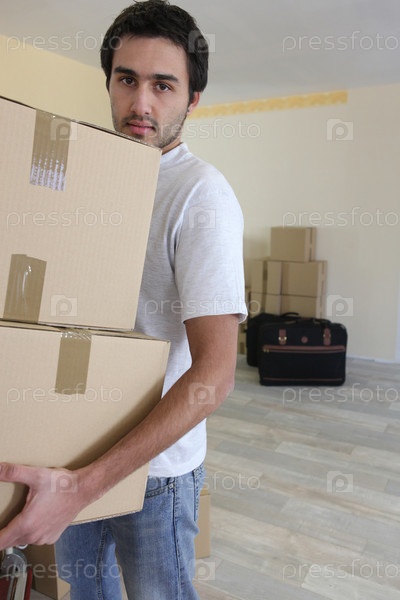 Мужчина несет коробки во время переезда