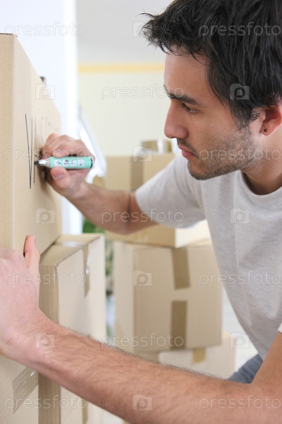 Молодой человек подписывает коробку для переезда
