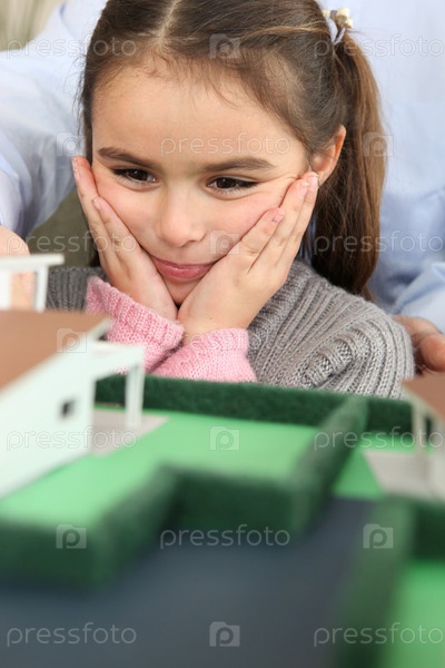 Девочка рассматривает модель дома
