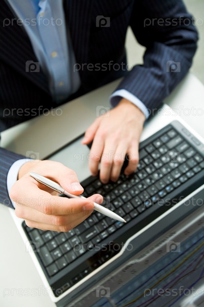 Верхний угол мужской руки с ручкой, указывающей на экран ноутбука на рабочем месте