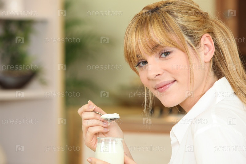 Женщина ест йогурт