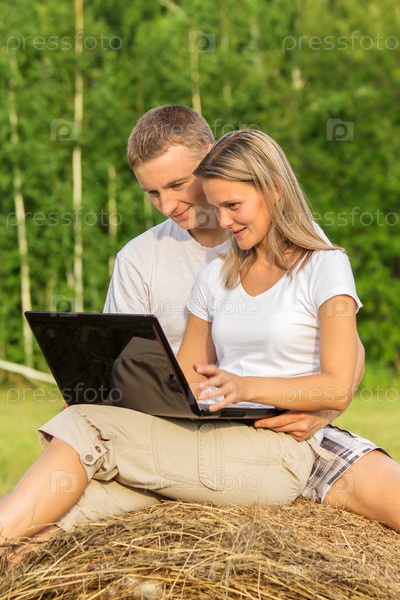 Молодая пара сидит на открытом воздухе с ноутбуком