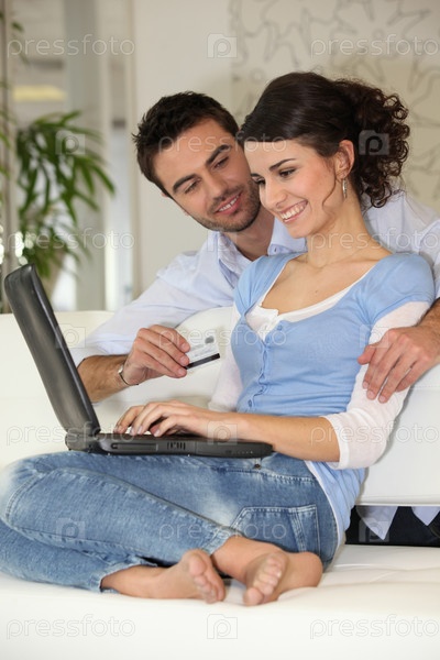 Пара с компьютером на диване